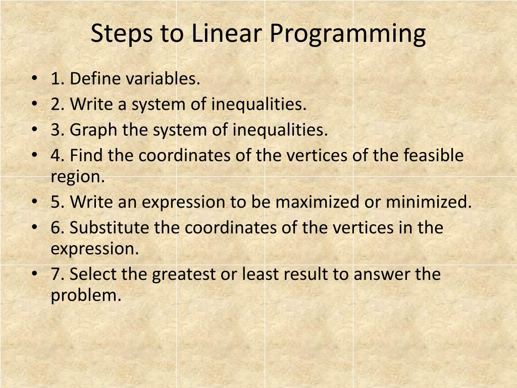 Steps to Linear Programming. 1. Define variables. 2. Write a system of inequalities. 3. Graph the system of inequalities. 4. Find the coordinates of the vertices of the feasible region. 5. Write an expression to be maximized or minimized.