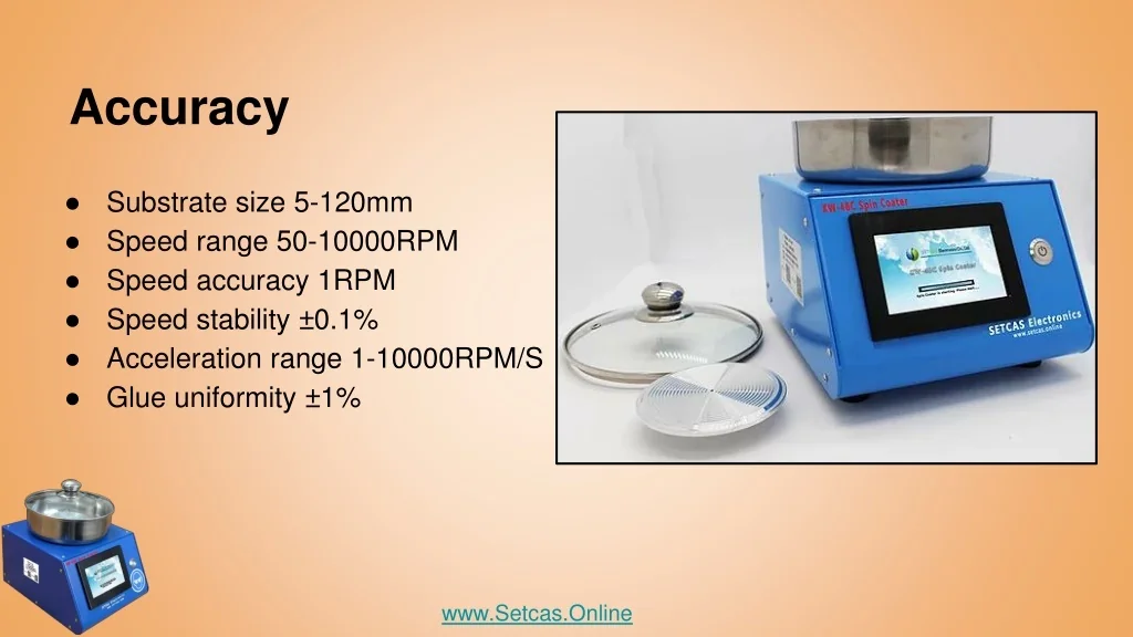 Accuracy • Substrate size 5-120mm • Speed range 50-10000RPM • Speed accuracy 1RPM • Speed stability ±0.1% • Acceleration range 1-10000RPM/S • Glue uniformity ±1% www.Setcas.Online