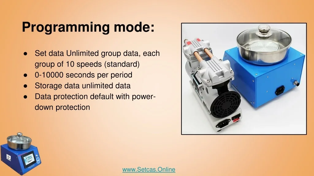 Programming mode: • Set data Unlimited group data, each group of 10 speeds (standard) • 0-10000 seconds per period • Storage data unlimited data • Data protection default with power-down protection www.Setcas.Online