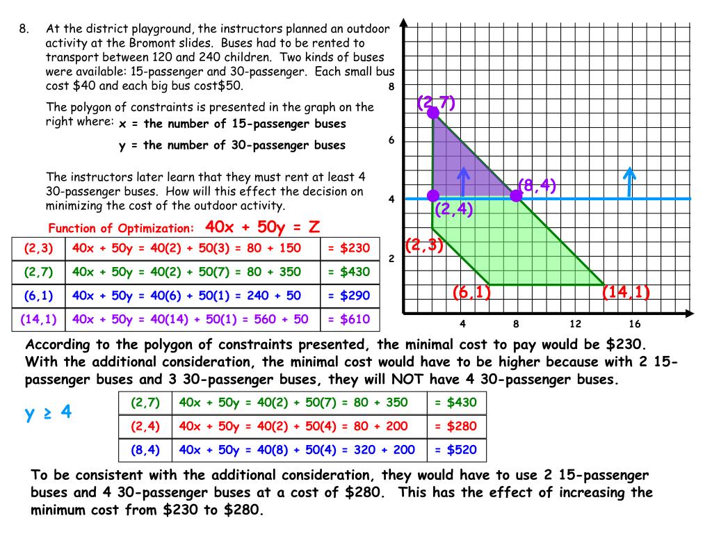 (2,7) (8,4) (2,4) • At the district playground, the instructors planned an outdoor activity at the Bromont slides. Buses had to be rented to transport between 120 and 240 children. Two kinds of buses were available: 15-passenger and 30-passenger. Each small bus cost $40 and each big bus cost$50. • The polygon of constraints is presented in the graph on the right where: 8 (2,7) x = the number of 15-passenger buses y = the number of 30-passenger buses 6 The instructors later learn that they must rent at least 4 30-passenger buses. How will this effect the decision on minimizing the cost of the outdoor activity. 4 Function of Optimization: 40x + 50y = Z (2,3) (2,3) 40x + 50y = 40(2) + 50(3) = 80 + 150 = $230 2 (2,7) 40x + 50y = 40(2) + 50(7) = 80 + 350 = $430 (6,1) (14,1) (6,1) 40x + 50y = 40(6) + 50(1) = 240 + 50 = $290 (14,1) 40x + 50y = 40(14) + 50(1) = 560 + 50 = $610 4 8 12 16 According to the polygon of constraints presented, the minimal cost to pay would be $230. With the additional consideration, the minimal cost would have to be higher because with 2 15-passenger buses and 3 30-passenger buses, they will NOT have 4 30-passenger buses. (2,7) 40x + 50y = 40(2) + 50(7) = 80 + 350 = $430 y ≥ 4 (2,4) 40x + 50y = 40(2) + 50(4) = 80 + 200 = $280 (8,4) 40x + 50y = 40(8) + 50(4) = 320 + 200 = $520 To be consistent with the additional consideration, they would have to use 2 15-passenger buses and 4 30-passenger buses at a cost of $280. This has the effect of increasing the minimum cost from $230 to $280.