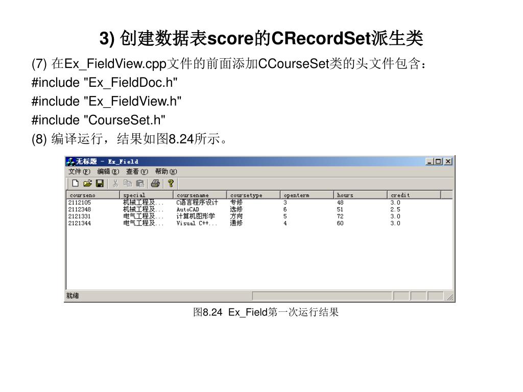 3) 创建数据表score的CRecordSet派生类 • (7) 在Ex_FieldView.cpp文件的前面添加CCourseSet类的头文件包含: • #include "Ex_FieldDoc.h" • #include "Ex_FieldView.h" • #include "CourseSet.h" • (8) 编译运行,结果如图8.24所示。 图8.24 Ex_Field第一次运行结果