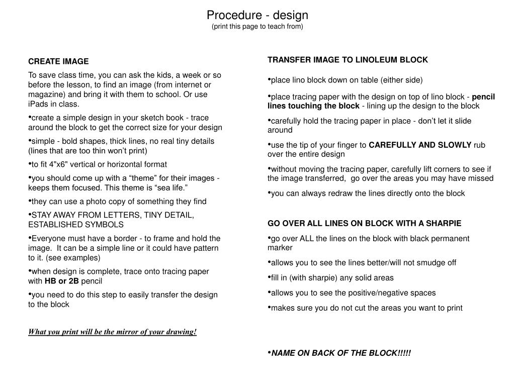 Procedure - design (print this page to teach from) TRANSFER IMAGE TO LINOLEUM BLOCK • place lino block down on table (either side) • place tracing paper with the design on top of lino block - pencil lines touching the block - lining up the design to the block • carefully hold the tracing paper in place - don’t let it slide around • use the tip of your finger to CAREFULLY AND SLOWLY rub over the entire design • without moving the tracing paper, carefully lift corners to see if the image transferred, go over the areas you may have missed • you can always redraw the lines directly onto the block GO OVER ALL LINES ON BLOCK WITH A SHARPIE • go over ALL the lines on the block with black permanent marker • allows you to see the lines better/will not smudge off • fill in (with sharpie) any solid areas • allows you to see the positive/negative spaces • makes sure you do not cut the areas you want to print • NAME ON BACK OF THE BLOCK!!!!! CREATE IMAGE To save class time, you can ask the kids, a week or so before the lesson, to find an image (from internet or magazine) and bring it with them to school. Or use iPads in class. • create a simple design in your sketch book - trace around the block to get the correct size for your design • simple - bold shapes, thick lines, no real tiny details (lines that are too thin won’t print) • to fit 4"x6" vertical or horizontal format • you should come up with a “theme” for their images - keeps them focused. This theme is “sea life.” • they can use a photo copy of something they find • STAY AWAY FROM LETTERS, TINY DETAIL, ESTABLISHED SYMBOLS • Everyone must have a border - to frame and hold the image. It can be a simple line or it could have pattern to it. (see examples) • when design is complete, trace onto tracing paper with HB or 2B pencil • you need to do this step to easily transfer the design to the block What you print will be the mirror of your drawing!