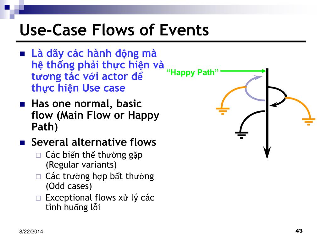 Làdãycáchànhđộngmàhệthốngphảithựchiệnvàtươngtácvới actor đểthựchiện Use case Has one normal, basic flow (Main Flow or Happy Path) Several alternative flows Cácbiếnthểthườnggặp (Regular variants) Cáctrườnghợpbấtthường (Odd cases) Exceptional flows xửlýcáctìnhhuốnglỗi “Happy Path” Use-Case Flows of Events