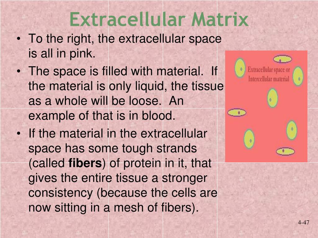 Extracellular Matrix • To the right, the extracellular space is all in pink. • The space is filled with material. If the material is only liquid, the tissue as a whole will be loose. An example of that is in blood. • If the material in the extracellular space has some tough strands (called fibers) of protein in it, that gives the entire tissue a stronger consistency (because the cells are now sitting in a mesh of fibers).