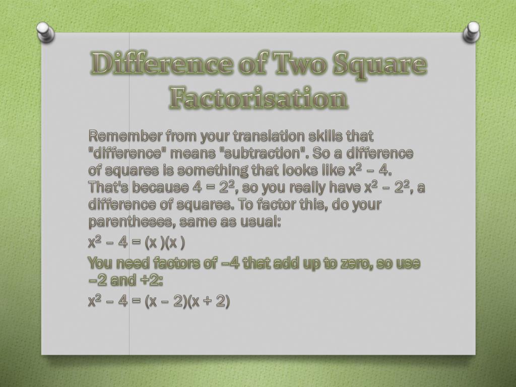 Difference of Two Square Factorisation Remember from your translation skills that "difference" means "subtraction". So a difference of squares is something that looks like x2 – 4. That's because 4 = 22, so you really have x2 – 22, a difference of squares. To factor this, do your parentheses, same as usual: x2 – 4 = (x )(x ) You need factors of –4 that add up to zero, so use –2 and +2: x2 – 4 = (x – 2)(x + 2)