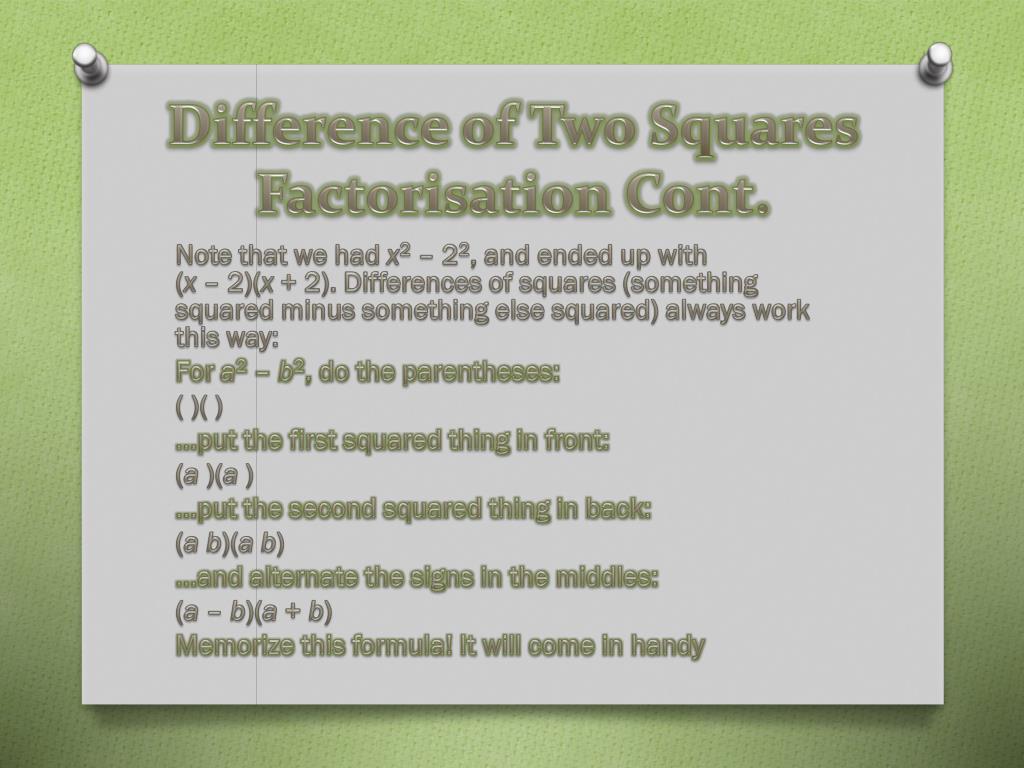 Difference of Two Squares Factorisation Cont. Note that we had x2 – 22, and ended up with (x – 2)(x + 2). Differences of squares (something squared minus something else squared) always work this way: For a2 – b2, do the parentheses: ( )( ) ...put the first squared thing in front: (a )(a ) ...put the second squared thing in back: (ab)(ab) ...and alternate the signs in the middles: (a – b)(a + b) Memorize this formula! It will come in handy