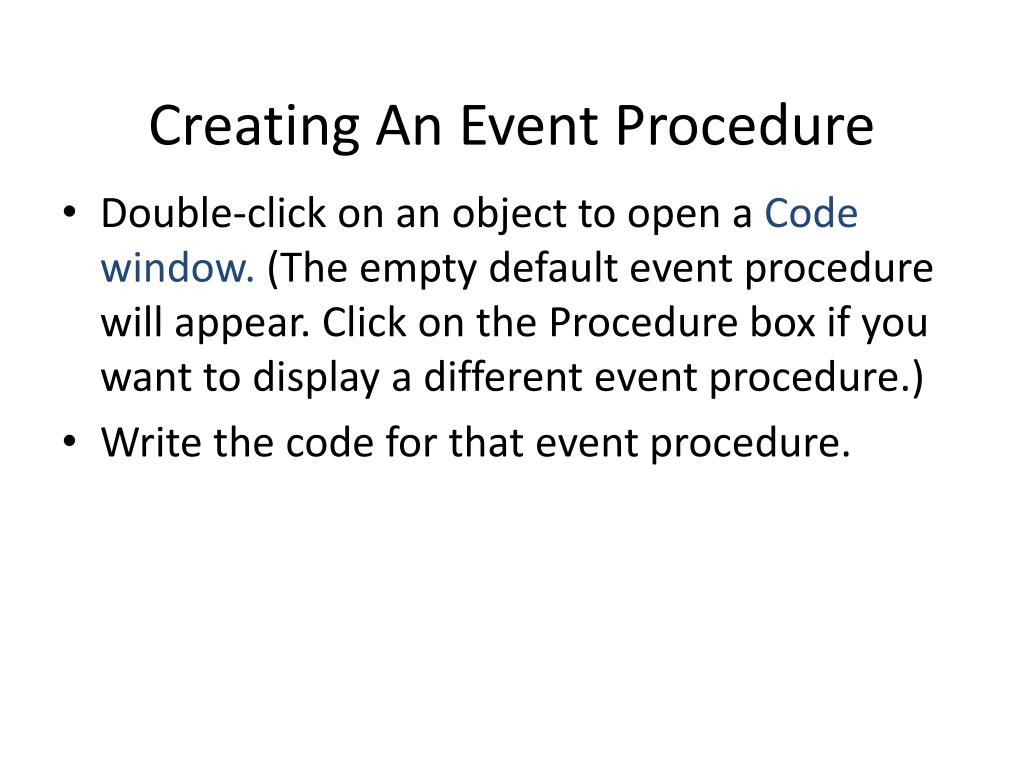 Creating An Event Procedure • Double-click on an object to open a Code window. (The empty default event procedure will appear. Click on the Procedure box if you want to display a different event procedure.) • Write the code for that event procedure.