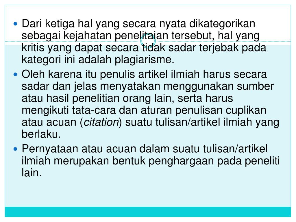 Dari ketigahal yang secaranyatadikategorikansebagaikejahatanpenelitaiantersebut, hal yang kritis yang dapatsecaratidaksadarterjebakpadakategoriiniadalahplagiarisme. Olehkarenaitupenulisartikelilmiahharussecarasadardanjelasmenyatakanmenggunakansumberatauhasilpenelitianorang lain, sertaharusmengikutitata-caradanaturanpenulisancuplikanatauacuan (citation) suatutulisan/artikelilmiah yang berlaku. Pernyataanatauacuandalamsuatutulisan/artikelilmiahmerupakanbentukpenghargaanpadapeneliti lain.