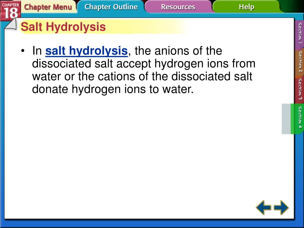 Salt Hydrolysis • In salt hydrolysis, the anions of the dissociated salt accept hydrogen ions from water or the cations of the dissociated salt donate hydrogen ions to water. Section 18-4