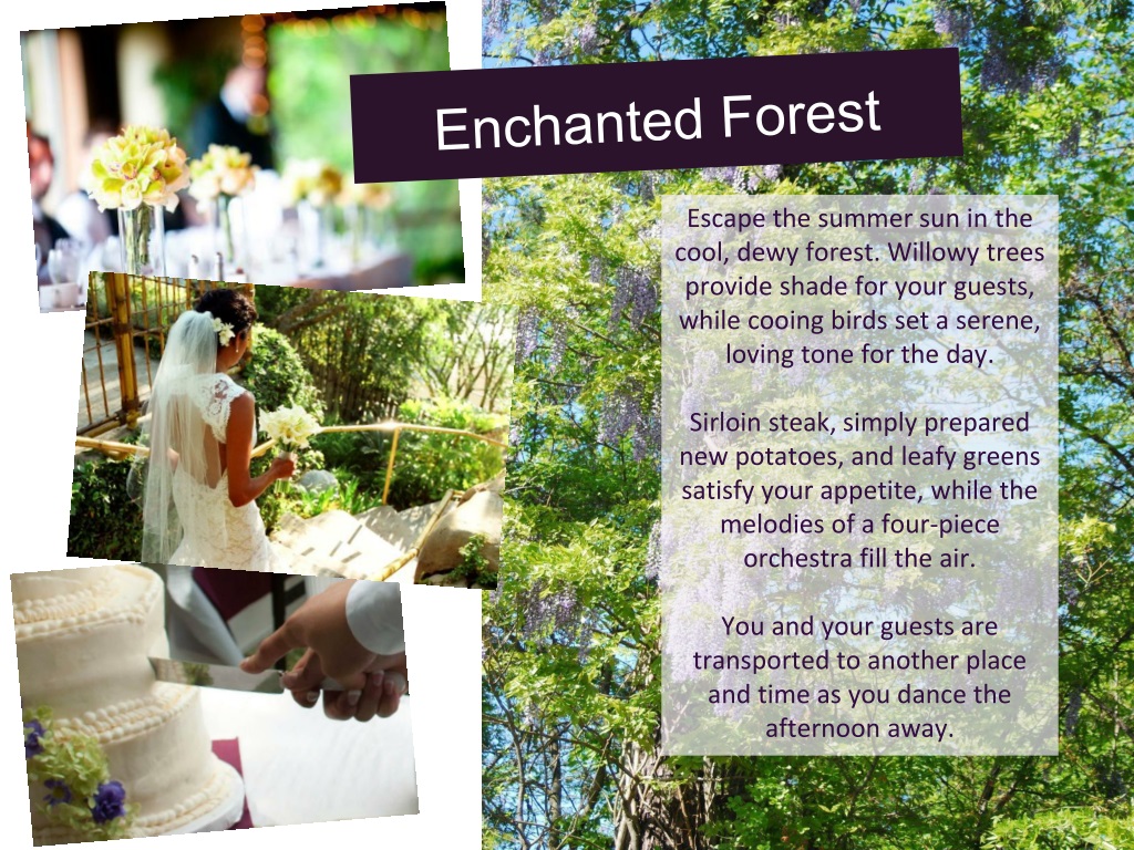 Enchanted Forest Escape the summer sun in the cool, dewy forest. Willowy trees provide shade for your guests, while cooing birds set a serene, loving tone for the day. Sirloin steak, simply prepared new potatoes, and leafy greens satisfy your appetite, while the melodies of a four-piece orchestra fill the air. You and your guests are transported to another place and time as you dance the afternoon away.