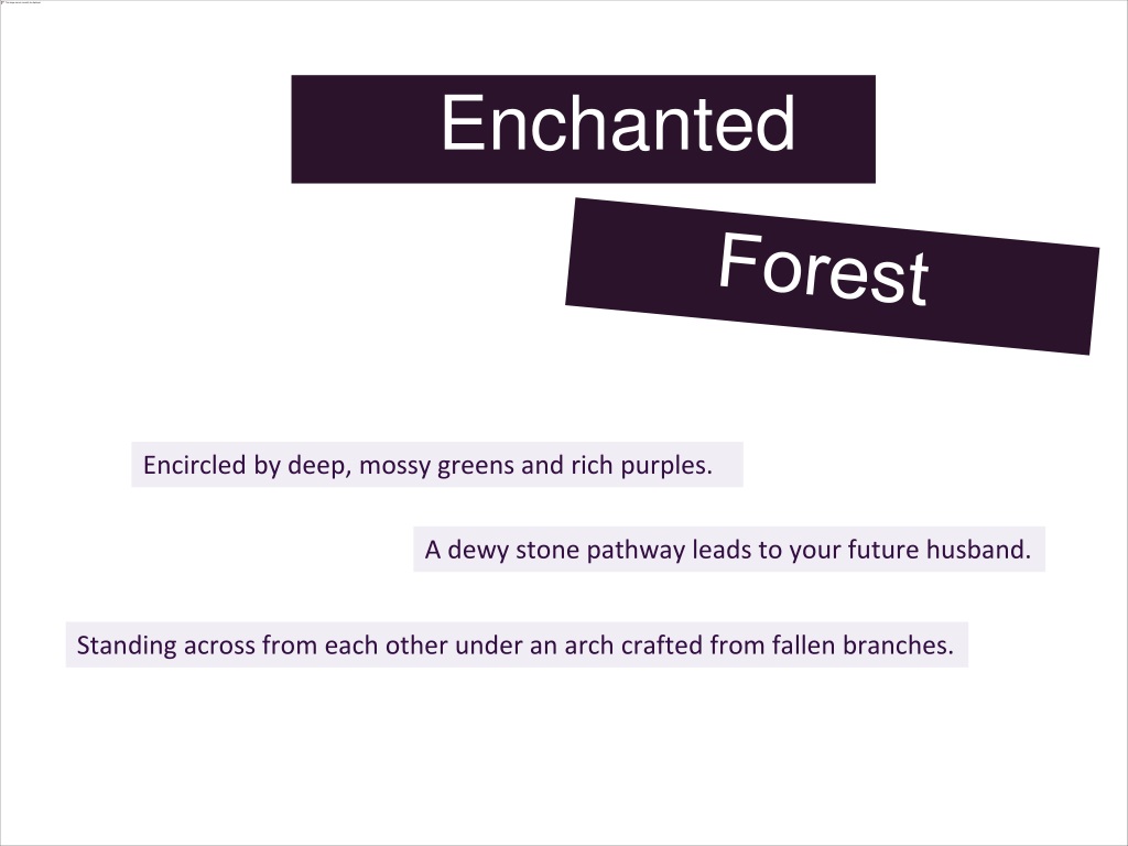 Enchanted Forest Encircled by deep, mossy greens and rich purples. A dewy stone pathway leads to your future husband. Standing across from each other under an arch crafted from fallen branches.