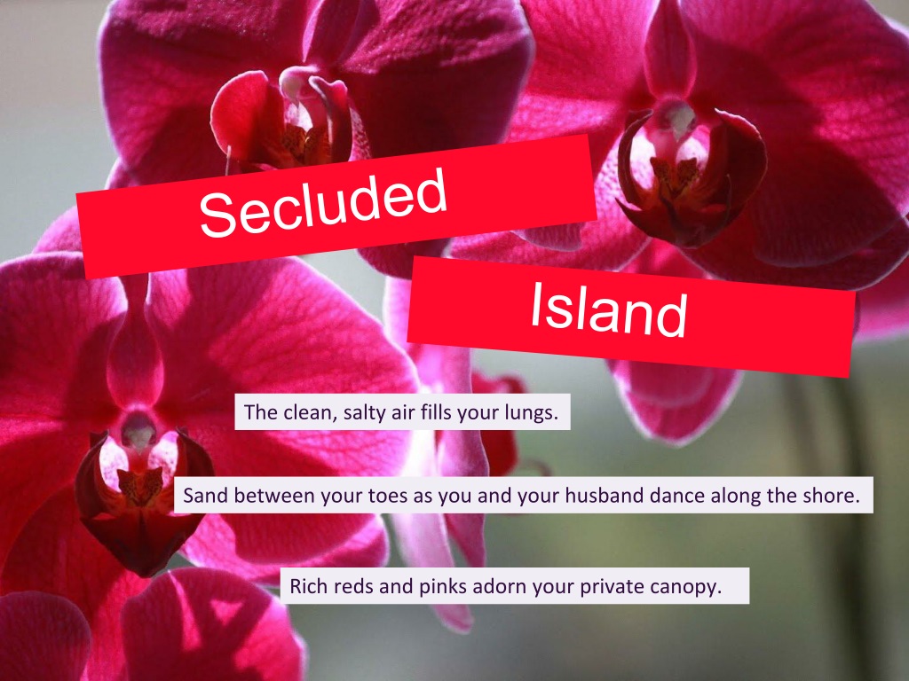 Secluded Island The clean, salty air fills your lungs. Sand between your toes as you and your husband dance along the shore. Rich reds and pinks adorn your private canopy.