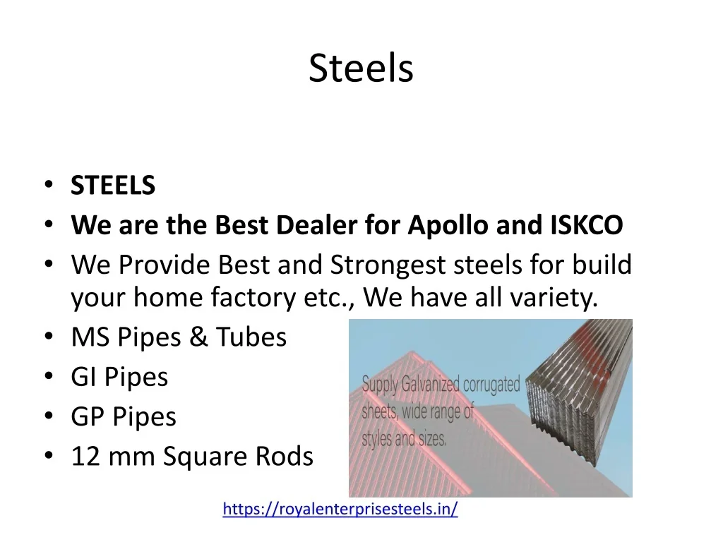 Steels • STEELS • We are the Best Dealer for Apollo and ISKCO • We Provide Best and Strongest steels for build your home factory etc., We have all variety. • MS Pipes & Tubes • GI Pipes • GP Pipes • 12 mm Square Rods https://royalenterprisesteels.in/