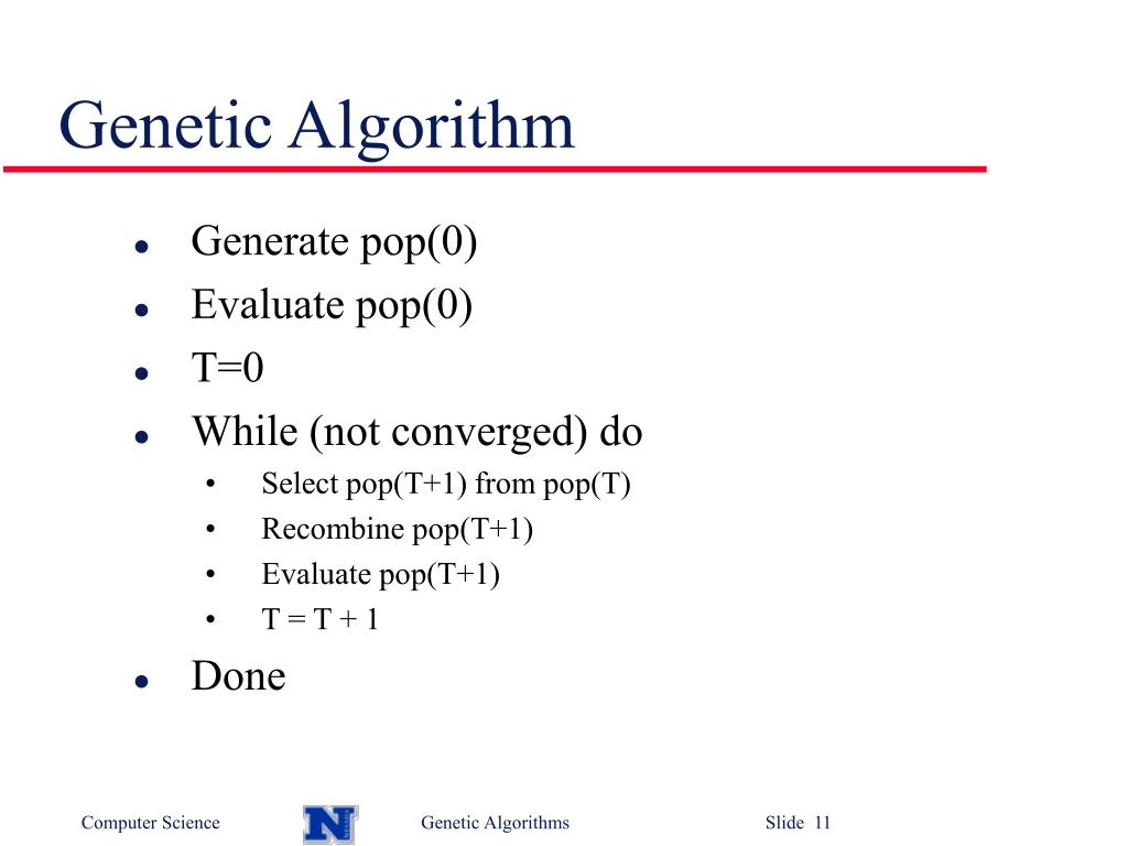 Genetic Algorithm • Generate pop(0) • Evaluate pop(0) • T=0 • While (not converged) do • Select pop(T+1) from pop(T) • Recombine pop(T+1) • Evaluate pop(T+1) • T = T + 1 • Done