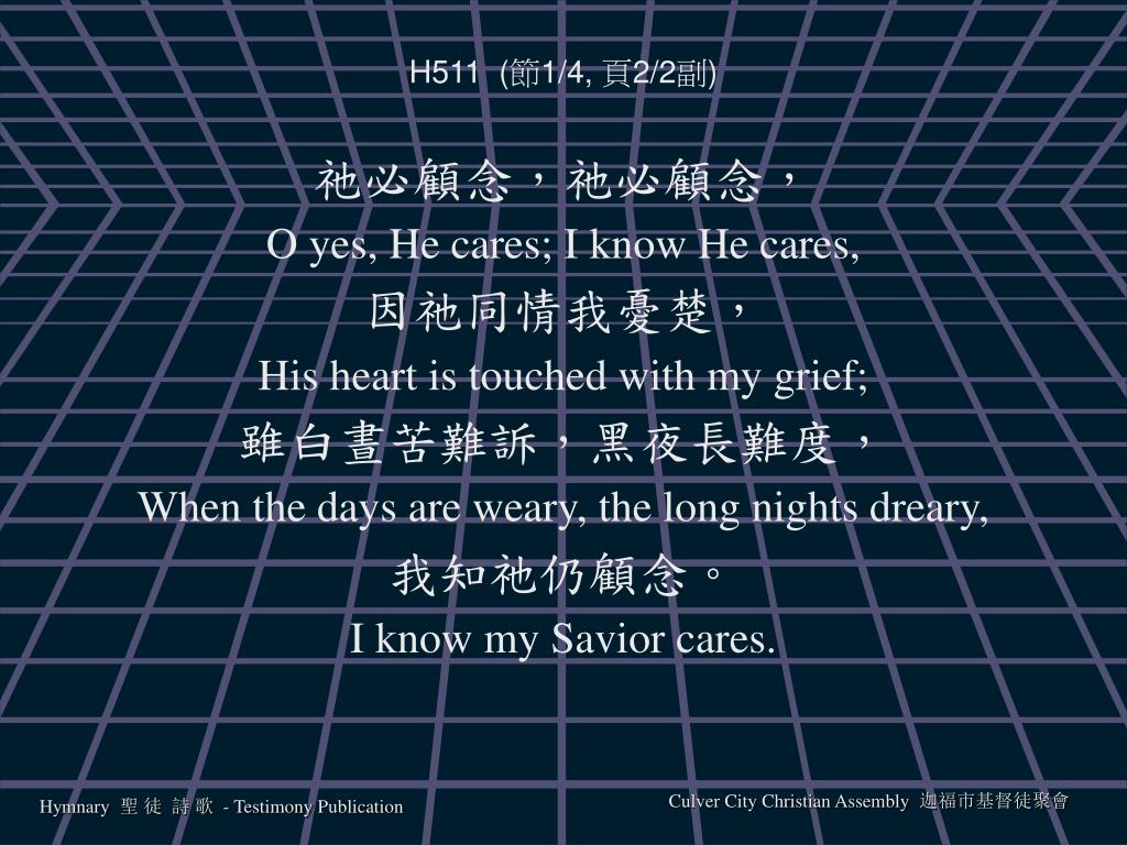 H511 (節2/4, 頁2/2副) 祂必顧念,祂必顧念, O yes, He cares; I know He cares, 因祂同情我憂楚, His heart is touched with my grief; 雖白晝苦難訴,黑夜長難度, When the days are weary, the long nights dreary, 我知祂仍顧念。 I know my Savior cares.