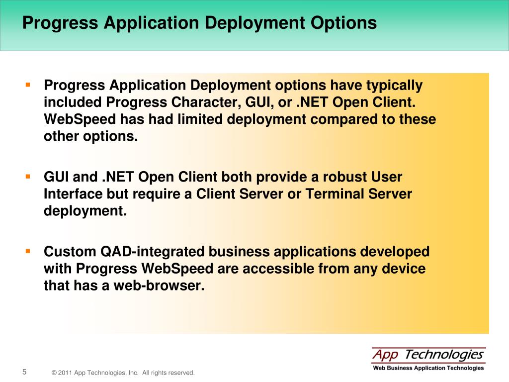 Progress Application Deployment Options Progress Application Deployment options have typically included Progress Character, GUI, or .NET Open Client. WebSpeed has had limited deployment compared to these other options. GUI and .NET Open Client both provide a robust User Interface but require a Client Server or Terminal Server deployment. Custom QAD-integrated business applications developed with Progress WebSpeed are accessible from any device that has a web-browser.