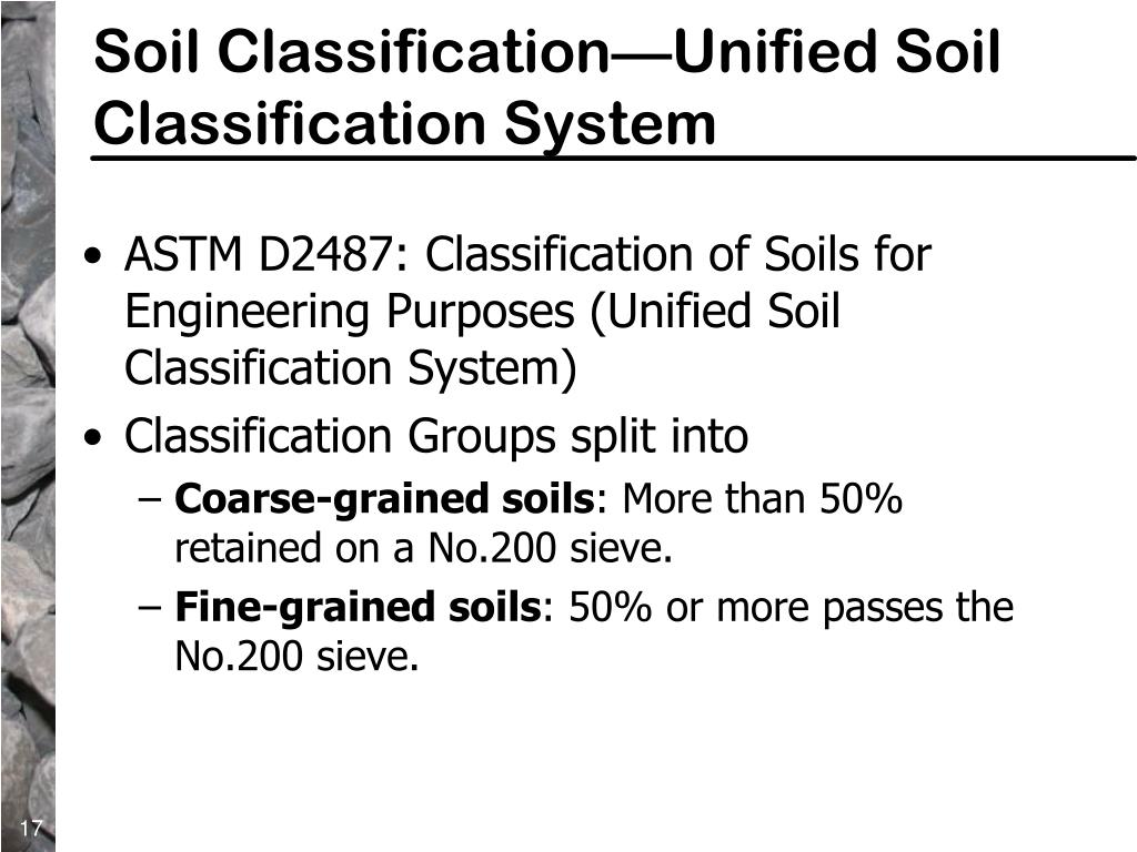 Soil Classification—Unified Soil Classification System • ASTM D2487: Classification of Soils for Engineering Purposes (Unified Soil Classification System) • Classification Groups split into • Coarse-grained soils: More than 50% retained on a No.200 sieve. • Fine-grained soils: 50% or more passes the No.200 sieve.