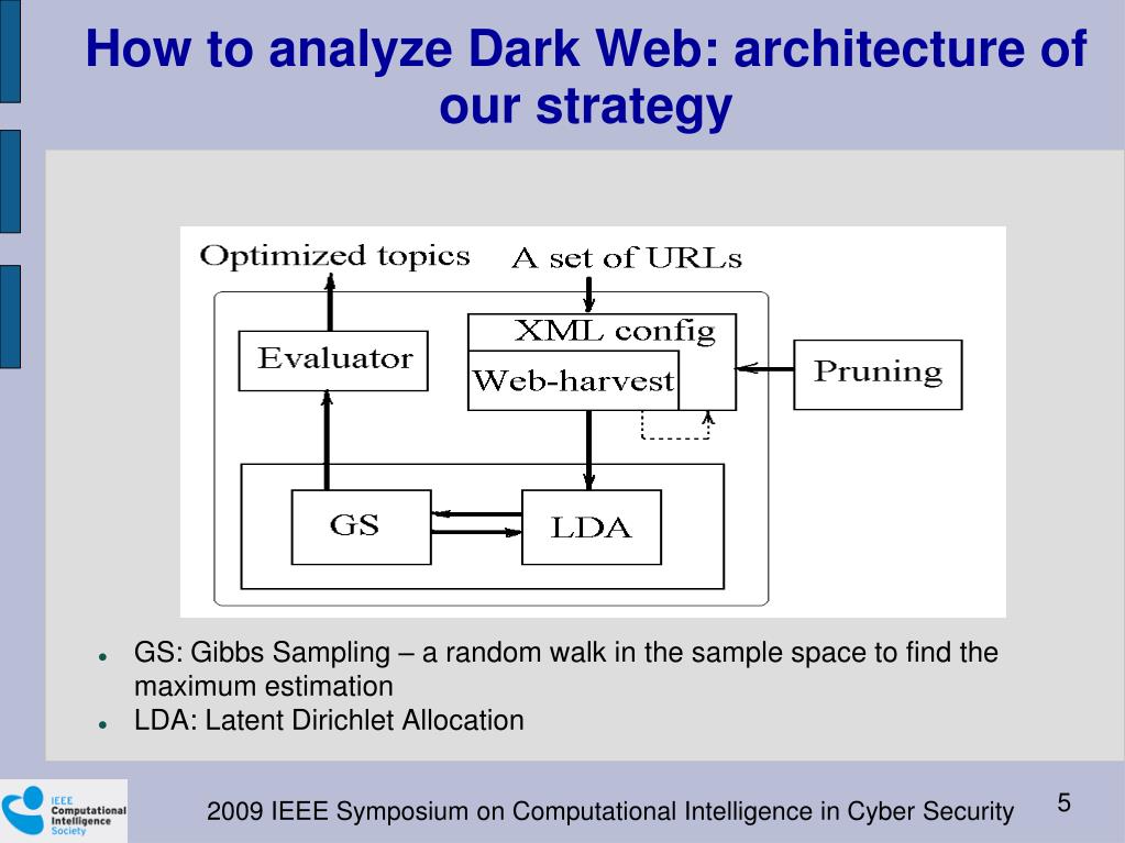 How to analyze Dark Web: architecture of our strategy • GS: Gibbs Sampling – a random walk in the sample space to find the maximum estimation • LDA: Latent Dirichlet Allocation