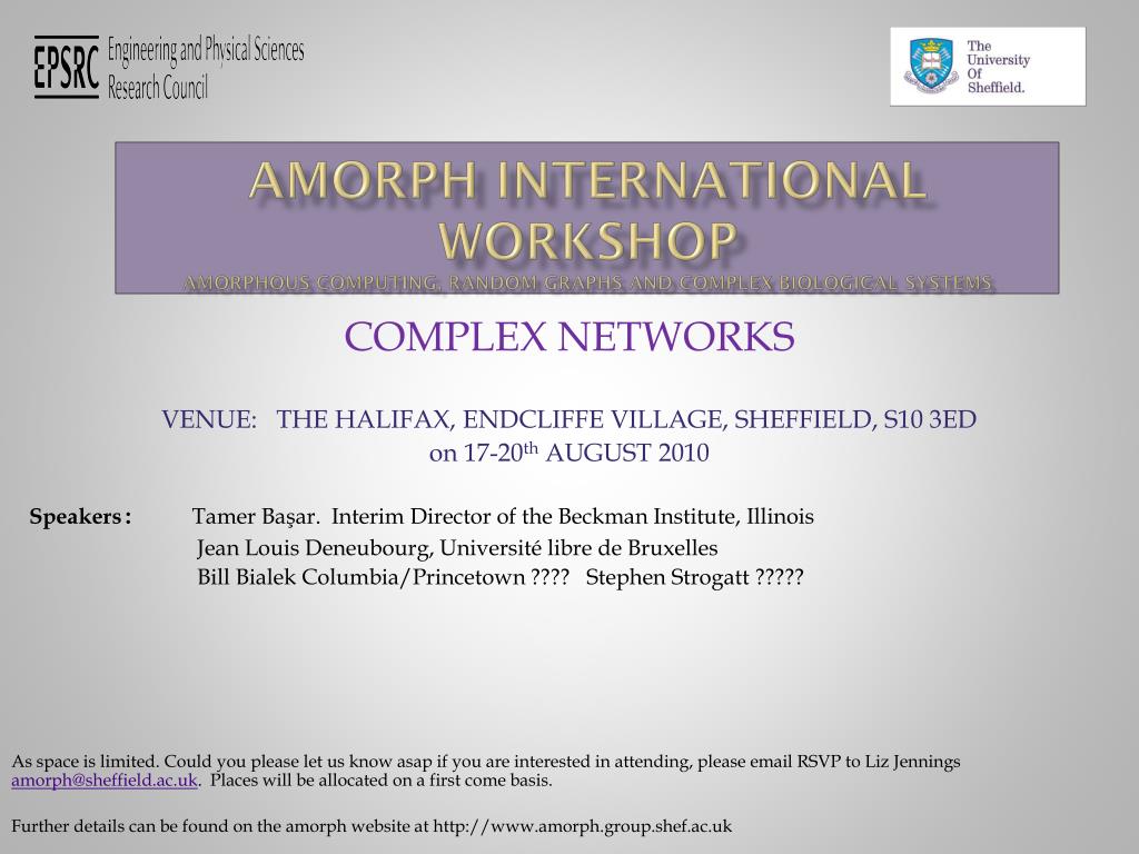 Amorph international WORKSHOPAmorphous computing, random graphs and complex biological systems COMPLEX NETWORKS VENUE: THE HALIFAX, ENDCLIFFE VILLAGE, SHEFFIELD, S10 3ED on 17-20th AUGUST 2010 Speakers : Tamer Başar. Interim Director of the Beckman Institute, Illinois Jean Louis Deneubourg, Universitélibre de Bruxelles Bill Bialek Columbia/Princetown ???? Stephen Strogatt ????? As space is limited. Could you please let us know asap if you are interested in attending, please email RSVP to Liz Jennings amorph@sheffield.ac.uk. Places will be allocated on a first come basis. Further details can be found on the amorph website at http://www.amorph.group.shef.ac.uk