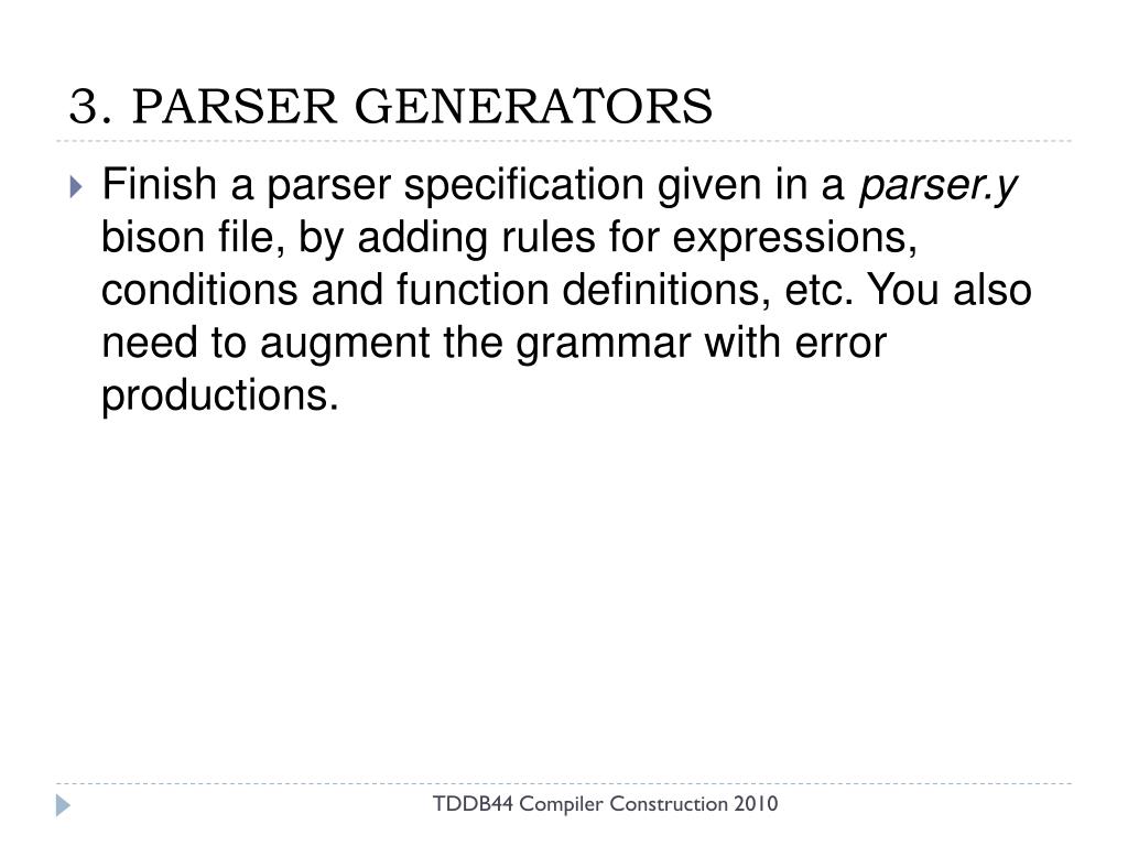3. PARSER GENERATORS • Finish a parser specification given in a parser.y bison file, by adding rules for expressions, conditions and function definitions, etc. You also need to augment the grammar with error productions. TDDB44 Compiler Construction 2010
