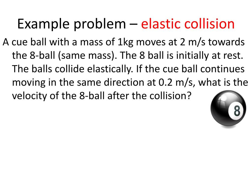Example problem – elastic collision A cue ball with a mass of 1kg moves at 2 m/s towards the 8-ball (same mass). The 8 ball is initially at rest. The balls collide elastically. If the cue ball continues moving in the same direction at 0.2 m/s, what is the velocity of the 8-ball after the collision?