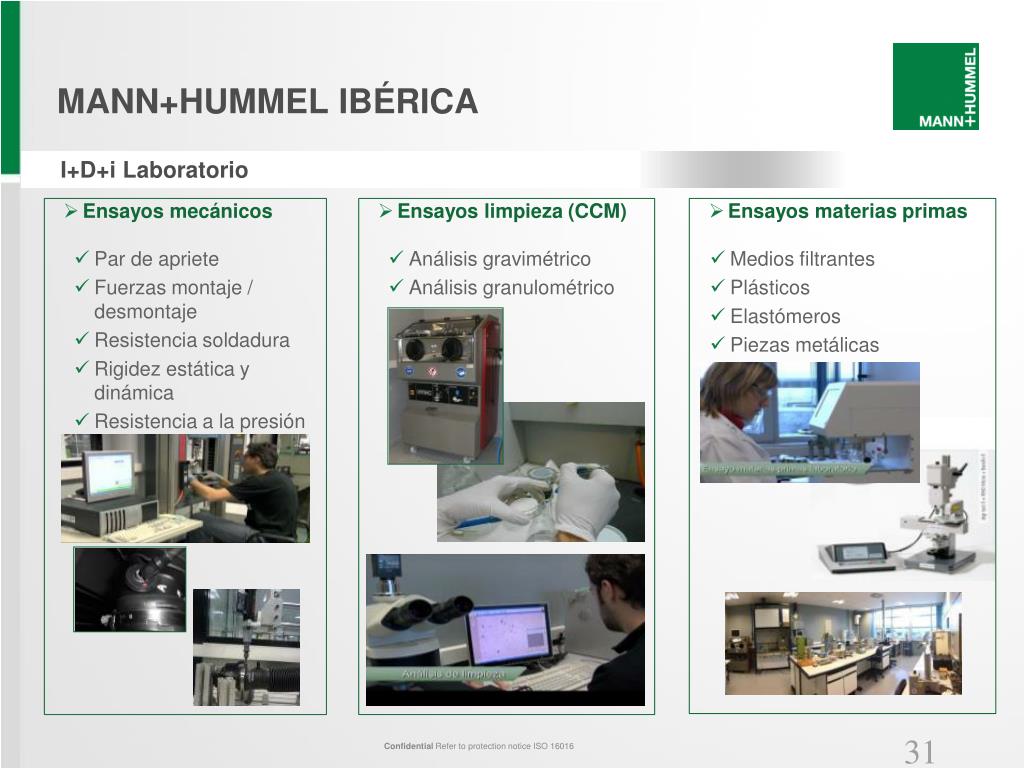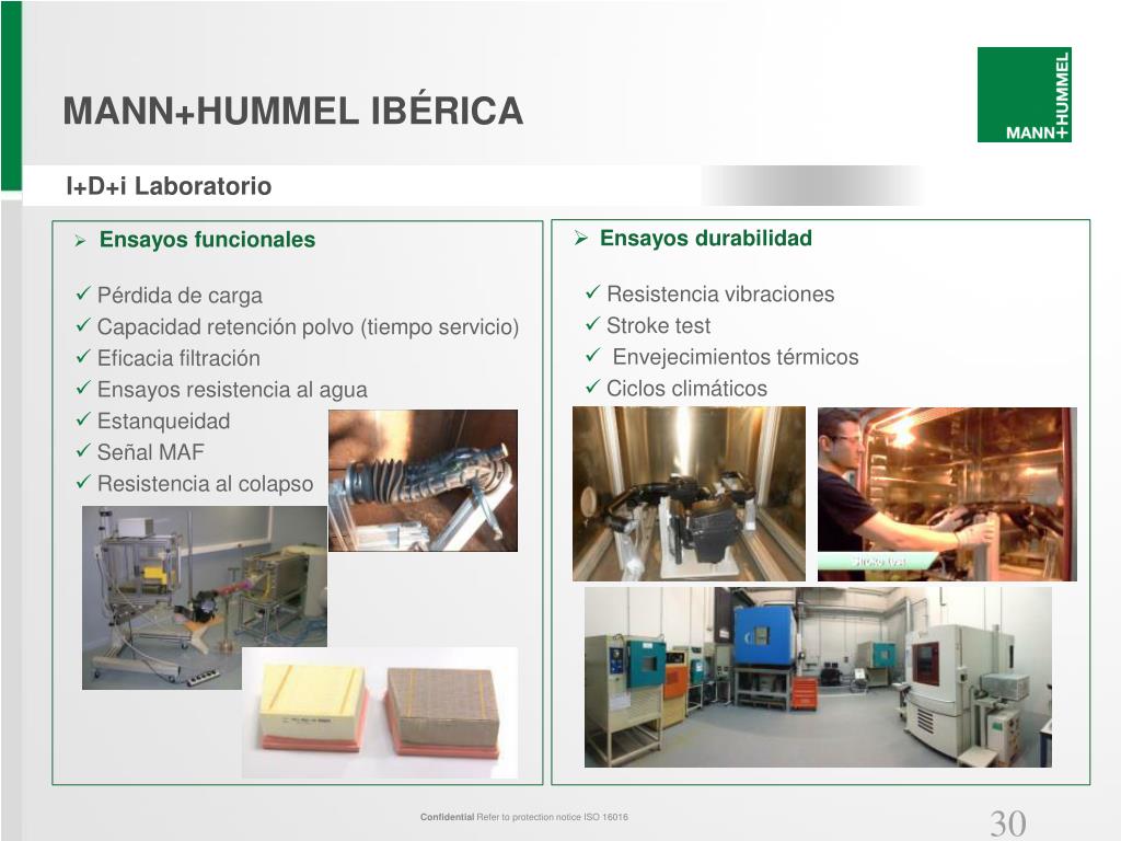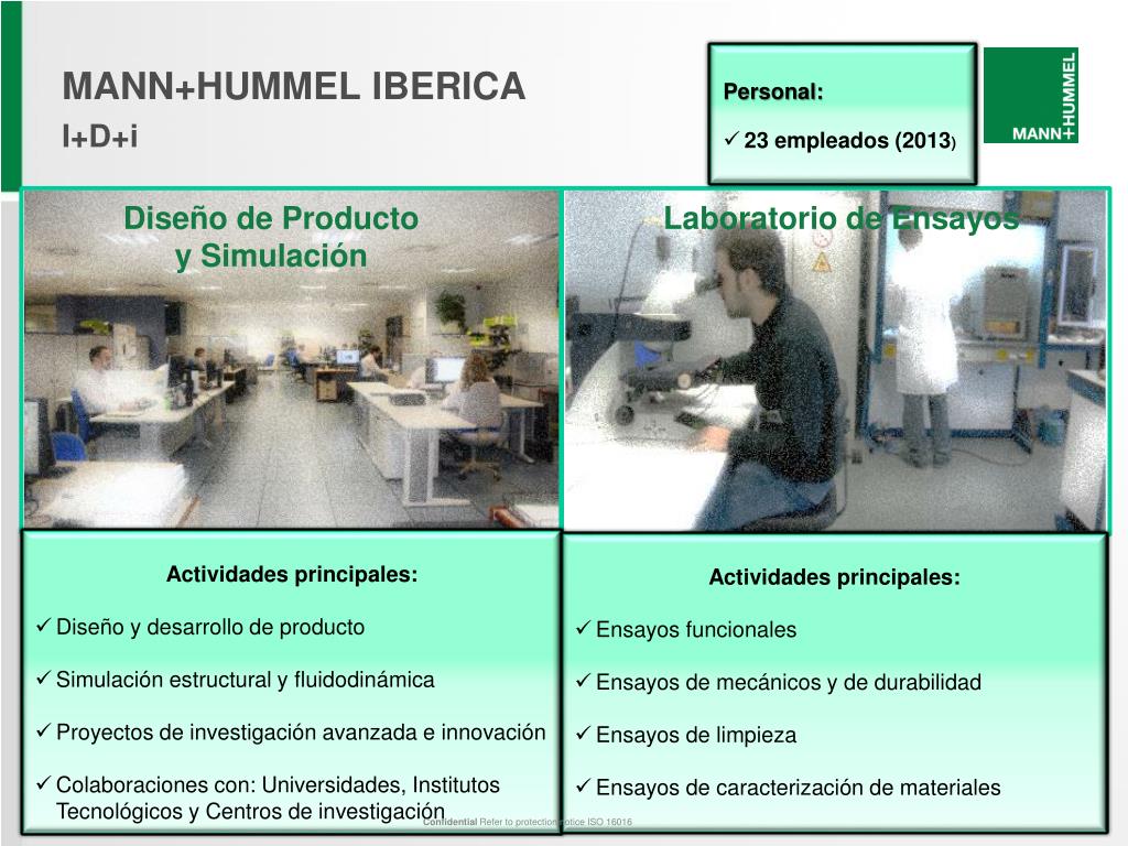 Personal: • 23 empleados (2013) • MANN+HUMMEL IBERICA • I+D+i Diseño de Producto y Simulación Laboratorio de Ensayos • Actividades principales: • Diseño y desarrollo de producto • Simulación estructural y fluidodinámica • Proyectos de investigación avanzada e innovación • Colaboraciones con: Universidades, Institutos Tecnológicos y Centros de investigación • Actividadesprincipales: • Ensayos funcionales • Ensayos de mecánicos y de durabilidad • Ensayos de limpieza • Ensayos de caracterización de materiales Confidential Refer to protection notice ISO 16016