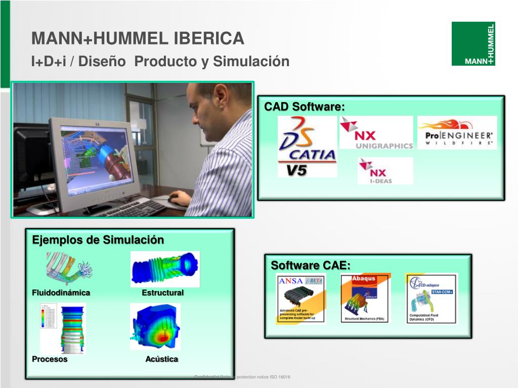 MANN+HUMMEL IBERICA • I+D+i / Diseño Producto y Simulación CAD Software: Software CAE: Ejemplos de Simulación Fluidodinámica Estructural Procesos Acústica Confidential Refer to protection notice ISO 16016