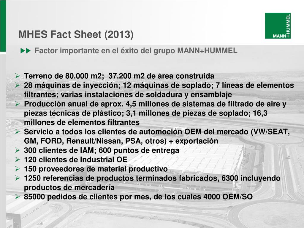 Terreno de 80.000 m2; 37.200 m2 de área construida • 28 máquinas de inyección; 12 máquinas de soplado; 7 líneas de elementos filtrantes; varias instalaciones de soldadura y ensamblaje • Producción anual de aprox. 4,5 millones de sistemas de filtrado de aire y piezas técnicas de plástico; 3,1 millones de piezas de soplado; 16,3 millones de elementos filtrantes • Servicio a todos los clientes de automoción OEM del mercado (VW/SEAT, GM, FORD, Renault/Nissan, PSA, otros) + exportación • 300 clientes de IAM; 600 puntos de entrega • 120 clientes de Industrial OE • 150 proveedores de material productivo • 1250 referencias de productos terminados fabricados, 6300 incluyendo productos de mercadería • 85000 pedidos de clientes por mes, de los cuales 4000 OEM/SO • MHES FactSheet(2013) • Factor importante en el éxito del grupo MANN+HUMMEL