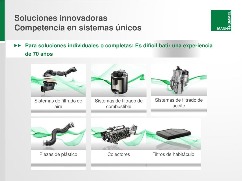 Soluciones innovadorasCompetencia en sistemasúnicos Para soluciones individuales o completas: Es difícil batir una experiencia de 70 años Sistemas de filtrado de aceite Sistemas de filtrado de aire Sistemas de filtrado de combustible Piezas de plástico Colectores Filtros de habitáculo