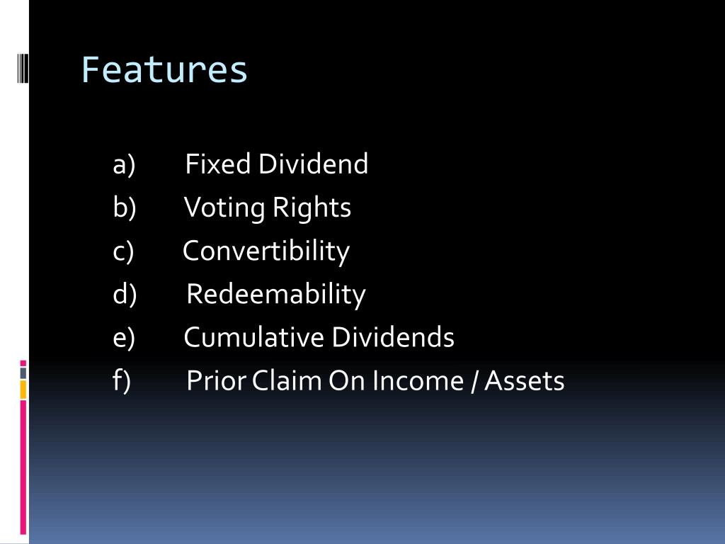 Features a) Fixed Dividend b) Voting Rights c) Convertibility d) Redeemability e) Cumulative Dividends f) Prior Claim On Income / Assets
