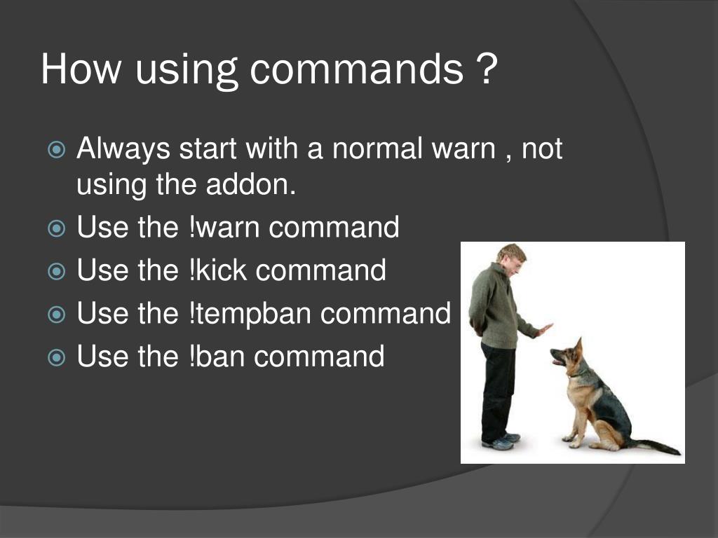 How using commands ? • Always start with a normal warn , not using the addon. • Use the !warn command • Use the !kick command • Use the !tempban command • Use the !ban command