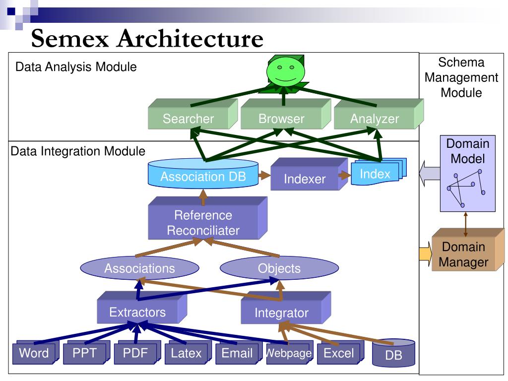 Searcher Searcher Browser Browser Analyzer Analyzer Domain Model Domain Model Association DB Association DB Index Index Indexer Indexer Reference Reconciliater Reference Reconciliater Domain Manager Associations Associations Objects Objects Extractors Extractors Integrator Integrator Word Word PPT PPT PDF PDF Latex Latex Email Email Webpage Webpage Excel Excel DB DB Semex Architecture Data Analysis Module Schema Management Module Data Integration Module Domain Manager