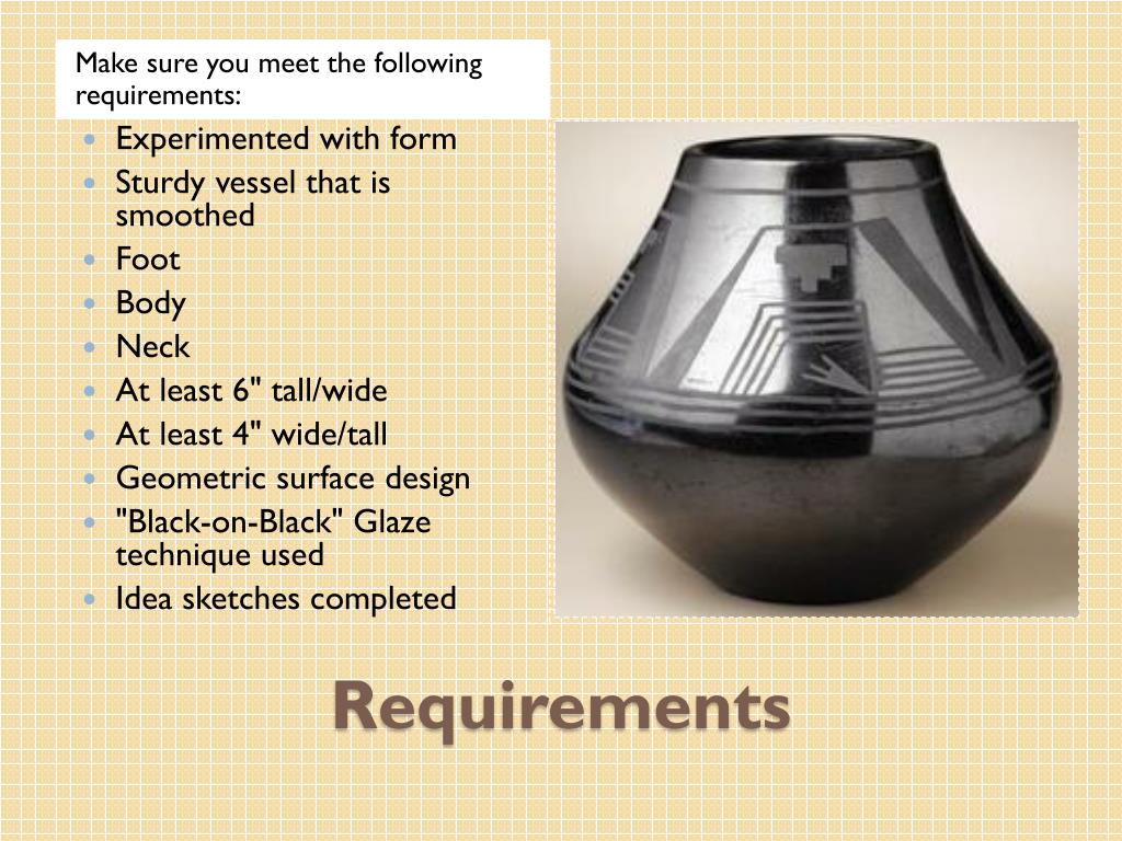 Make sure you meet the following requirements: • Experimented with form • Sturdy vessel that is smoothed • Foot • Body • Neck • At least 6" tall/wide • At least 4" wide/tall • Geometric surface design • "Black-on-Black" Glaze technique used • Idea sketches completed Requirements