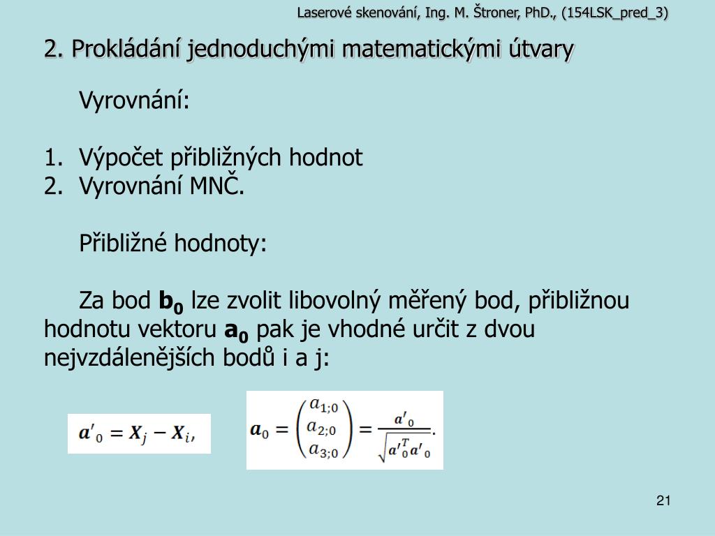 Laserové skenování, Ing. M. Štroner, PhD., (154LSK_pred_3) 2. Prokládání jednoduchými matematickými útvary • Vyrovnání: • Výpočet přibližných hodnot • Vyrovnání MNČ. • Přibližné hodnoty: • Za bod b0 lze zvolit libovolný měřený bod, přibližnou hodnotu vektoru a0 pak je vhodné určit z dvou nejvzdálenějších bodů i a j: