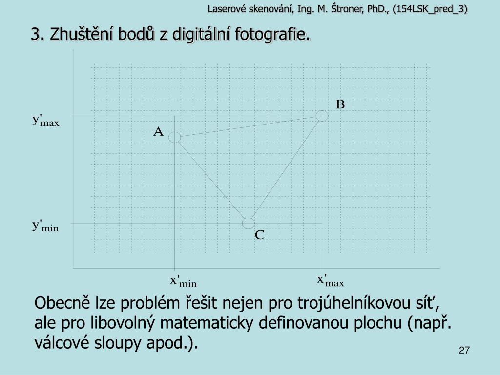Laserové skenování, Ing. M. Štroner, PhD., (154LSK_pred_3) 3. Zhuštění bodů z digitální fotografie. • Obecná rovnice roviny trojúhelníku: • Projektivní transformace obdobně