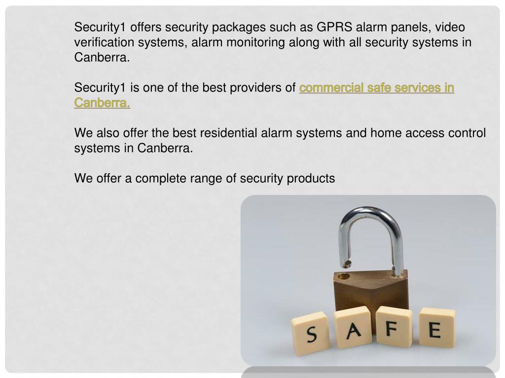 Security1 offers security packages such as GPRS alarm panels, video verification systems, alarm monitoring along with all security systems in Canberra. Security1 is one of the best providers of commercial safe services in Canberra. We also offer the best residential alarm systems and home access control systems in Canberra. We offer a complete range of security products