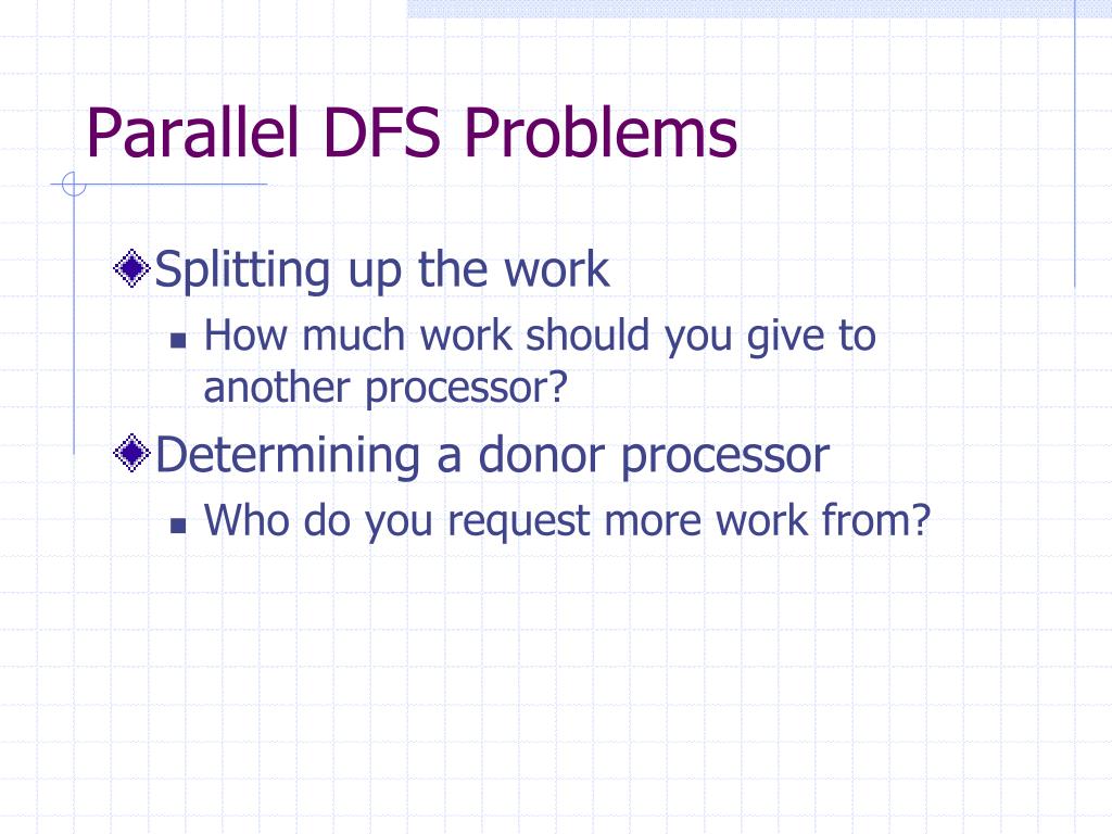 Parallel DFS Problems • Splitting up the work • How much work should you give to another processor? • Determining a donor processor • Who do you request more work from?