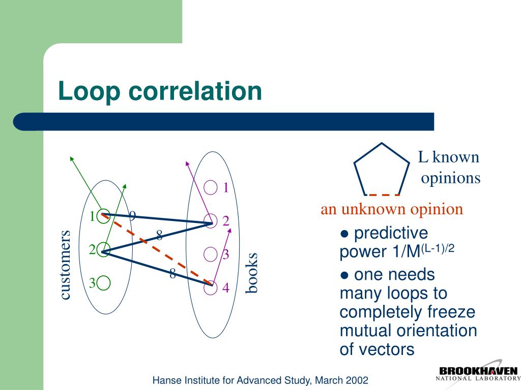 L known opinions 1 an unknown opinion 1 9 2 8 customers 2 3 books 8 3 4 Loop correlation • predictive power 1/M(L-1)/2 • one needs many loops to completely freezemutual orientation of vectors Hanse Institute for Advanced Study, March 2002