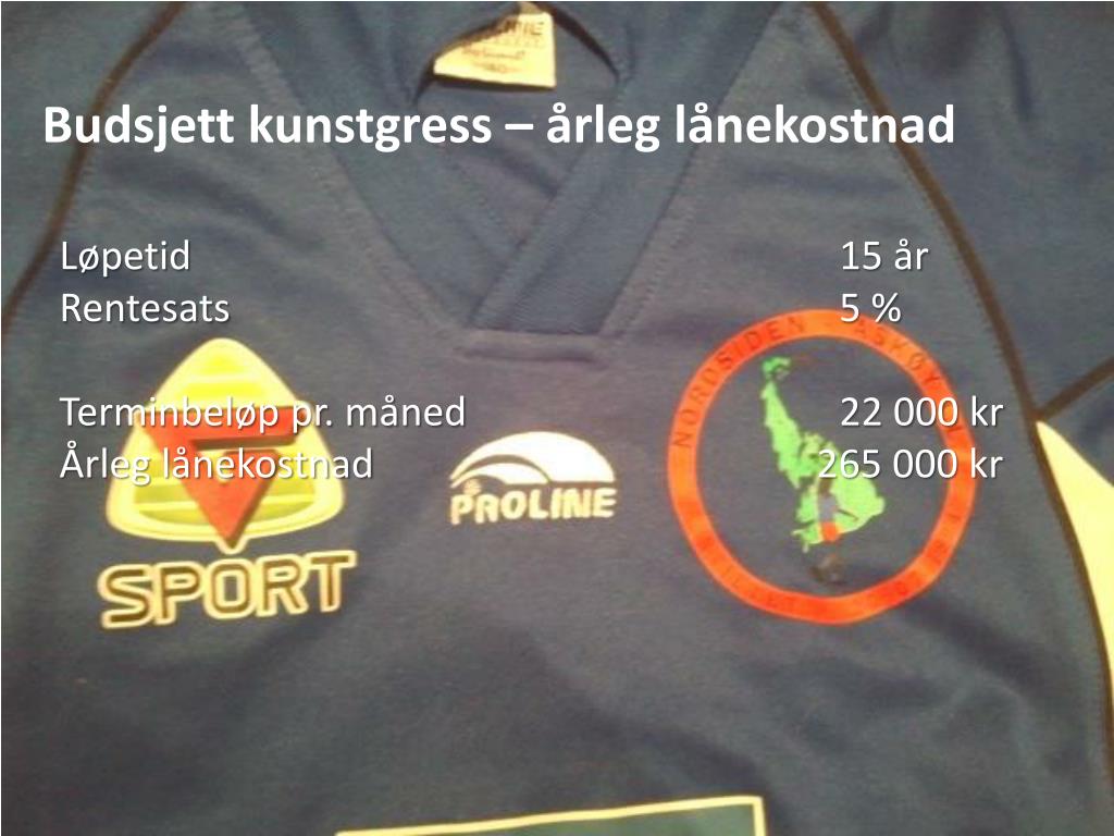 Budsjett kunstgress – årleg lånekostnad Løpetid 15 år Rentesats 5 % Terminbeløp pr. måned 22 000 kr Årleg lånekostnad 265 000 kr