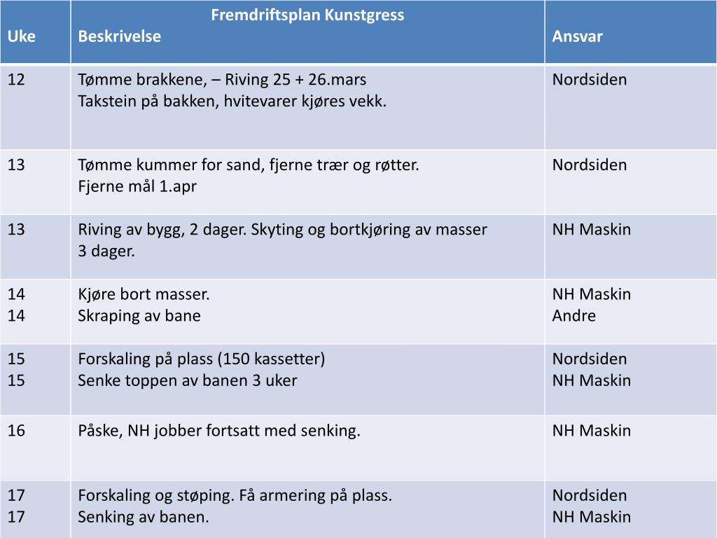 Status kunstgress • Prosessen frem til i dag • Gjennomgang fremdriftsplan • Bemanning - Ekte spilleglede har et navn!