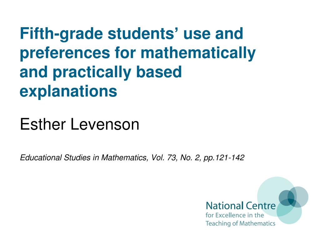 Fifth-grade students’ use and preferences for mathematically and practically based explanations Esther LevensonEducational Studies in Mathematics, Vol. 73, No. 2, pp.121-142