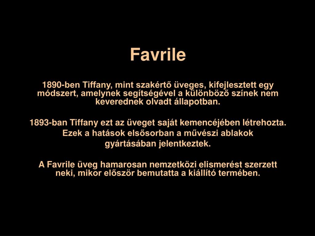 Favrile 1890-ben Tiffany, mint szakértő üveges, kifejlesztett egy módszert, amelynek segítségével a különböző színek nem keverednek olvadt állapotban. 1893-ban Tiffany ezt az üveget saját kemencéjében létrehozta. Ezek a hatások elsősorban a művészi ablakok gyártásában jelentkeztek. A Favrile üveg hamarosan nemzetközi elismerést szerzett neki, mikor először bemutatta a kiállító termében.