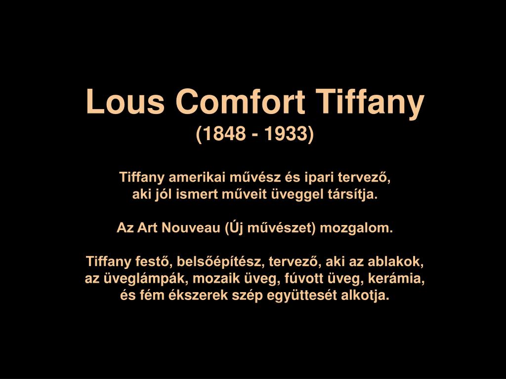 Lous Comfort Tiffany (1848 - 1933) Tiffany amerikai művész és ipari tervező, aki jól ismert műveit üveggel társítja. Az Art Nouveau (Új művészet) mozgalom. Tiffany festő, belsőépítész, tervező, aki az ablakok, az üveglámpák, mozaik üveg, fúvott üveg, kerámia, és fém ékszerek szép együttesét alkotja.