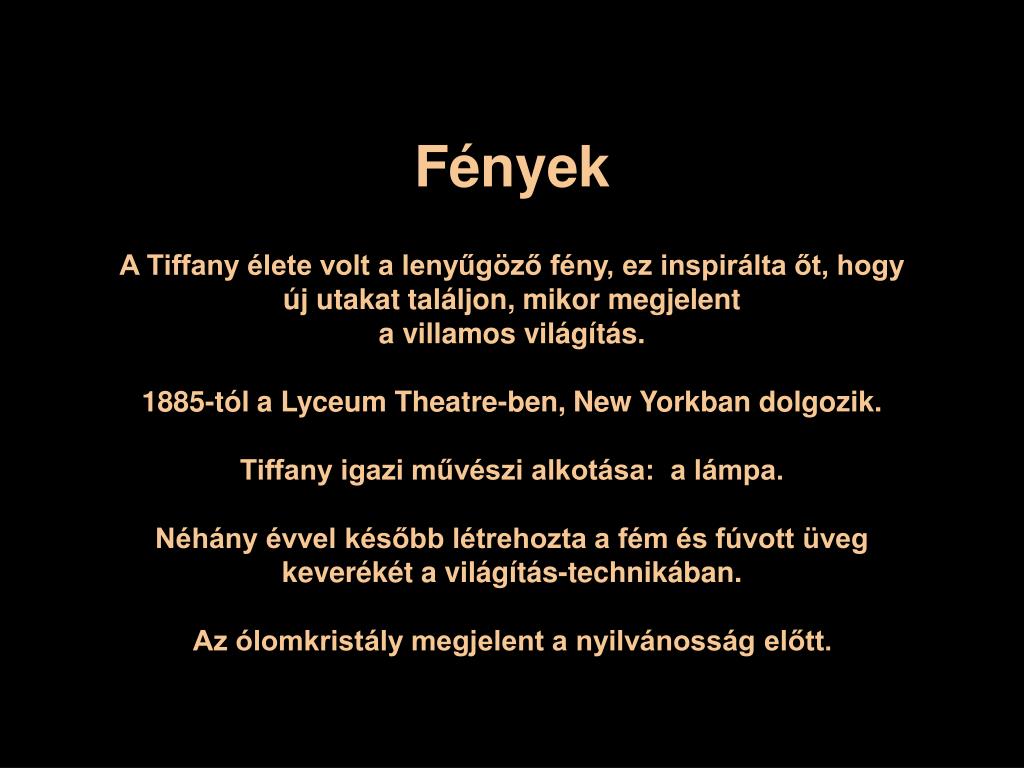 Fények A Tiffany élete volt a lenyűgöző fény, ez inspirálta őt, hogy új utakat találjon, mikor megjelent a villamos világítás. 1885-tól a Lyceum Theatre-ben, New Yorkban dolgozik. Tiffany igazi művészi alkotása: a lámpa. Néhány évvel később létrehozta a fém és fúvott üveg keverékét a világítás-technikában. Az ólomkristály megjelent a nyilvánosság előtt.