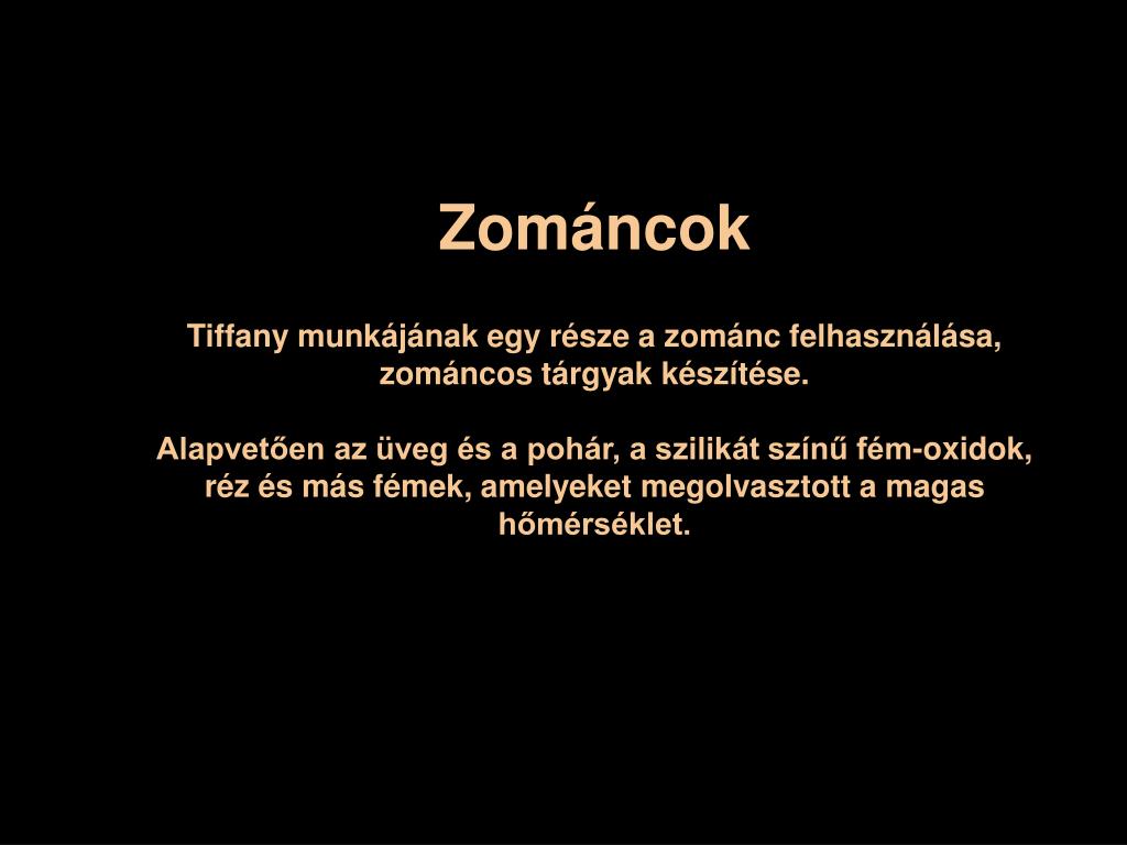 Zománcok Tiffany munkájának egy része a zománc felhasználása, zománcos tárgyak készítése. Alapvetően az üveg és a pohár, a szilikát színű fém-oxidok, réz és más fémek, amelyeket megolvasztott a magas hőmérséklet. Zománcok Tiffany munkájának egy része a zománc felhasználása, zománcos tárgyak készítése. Alapvetően az üveg és a pohár, a szilikát színű fém-oxidok, réz és más fémek, amelyeket megolvasztott a magas hőmérséklet.