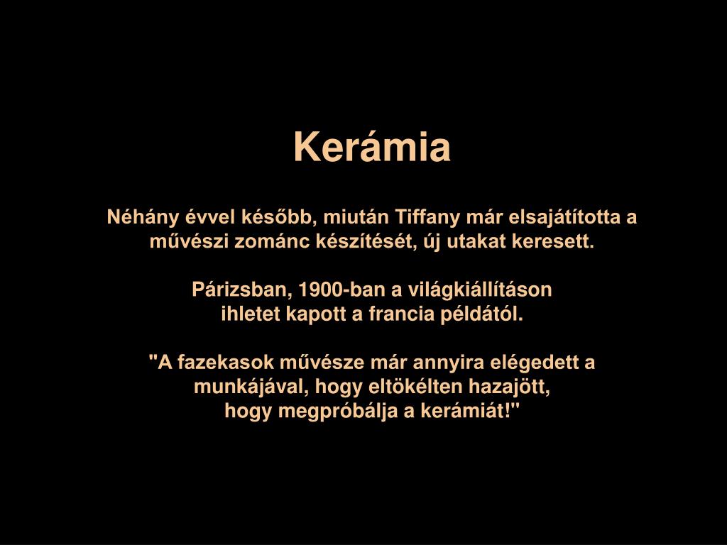 Kerámia Néhány évvel később, miután Tiffany már elsajátította a művészi zománc készítését, új utakat keresett. Párizsban, 1900-ban a világkiállításon ihletet kapott a francia példától. "A fazekasok művésze már annyira elégedett a munkájával, hogy eltökélten hazajött, hogy megpróbálja a kerámiát!"