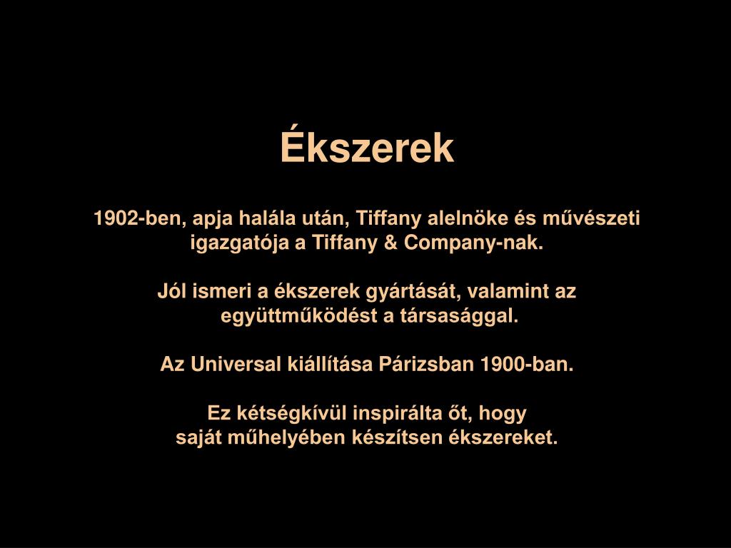Ékszerek 1902-ben, apja halála után, Tiffany alelnöke és művészeti igazgatója a Tiffany & Company-nak. Jól ismeri a ékszerek gyártását, valamint az együttműködést a társasággal. Az Universal kiállítása Párizsban 1900-ban. Ez kétségkívül inspirálta őt, hogy saját műhelyében készítsen ékszereket.
