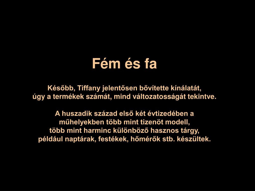 Fém és fa Később, Tiffany jelentősen bővítette kínálatát, úgy a termékek számát, mind változatosságát tekintve. A huszadik század első két évtizedében a műhelyekben több mint tizenöt modell, több mint harminc különböző hasznos tárgy, például naptárak, festékek, hőmérők stb. készültek.
