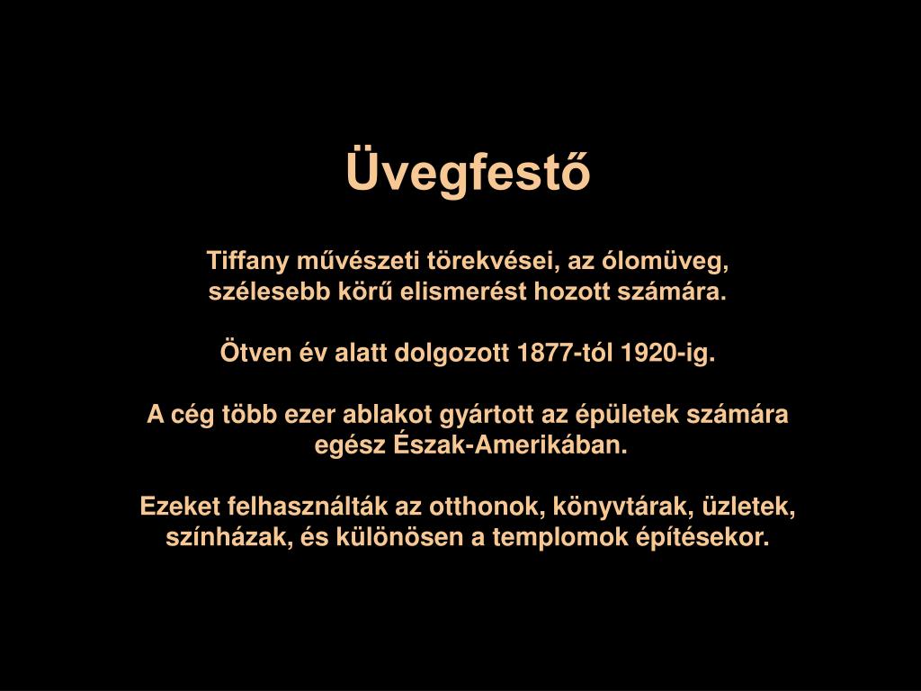 Üvegfestő Tiffany művészeti törekvései, az ólomüveg, szélesebb körű elismerést hozott számára. Ötven év alatt dolgozott 1877-tól 1920-ig. A cég több ezer ablakot gyártott az épületek számára egész Észak-Amerikában. Ezeket felhasználták az otthonok, könyvtárak, üzletek, színházak, és különösen a templomok építésekor.