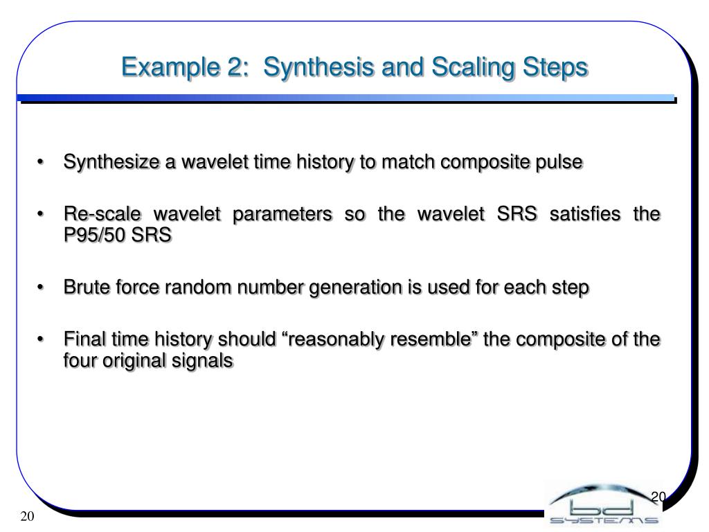 Example 2: Synthesis and Scaling Steps • Synthesize a wavelet time history to match composite pulse • Re-scale wavelet parameters so the wavelet SRS satisfies the P95/50 SRS • Brute force random number generation is used for each step • Final time history should “reasonably resemble” the composite of the four original signals